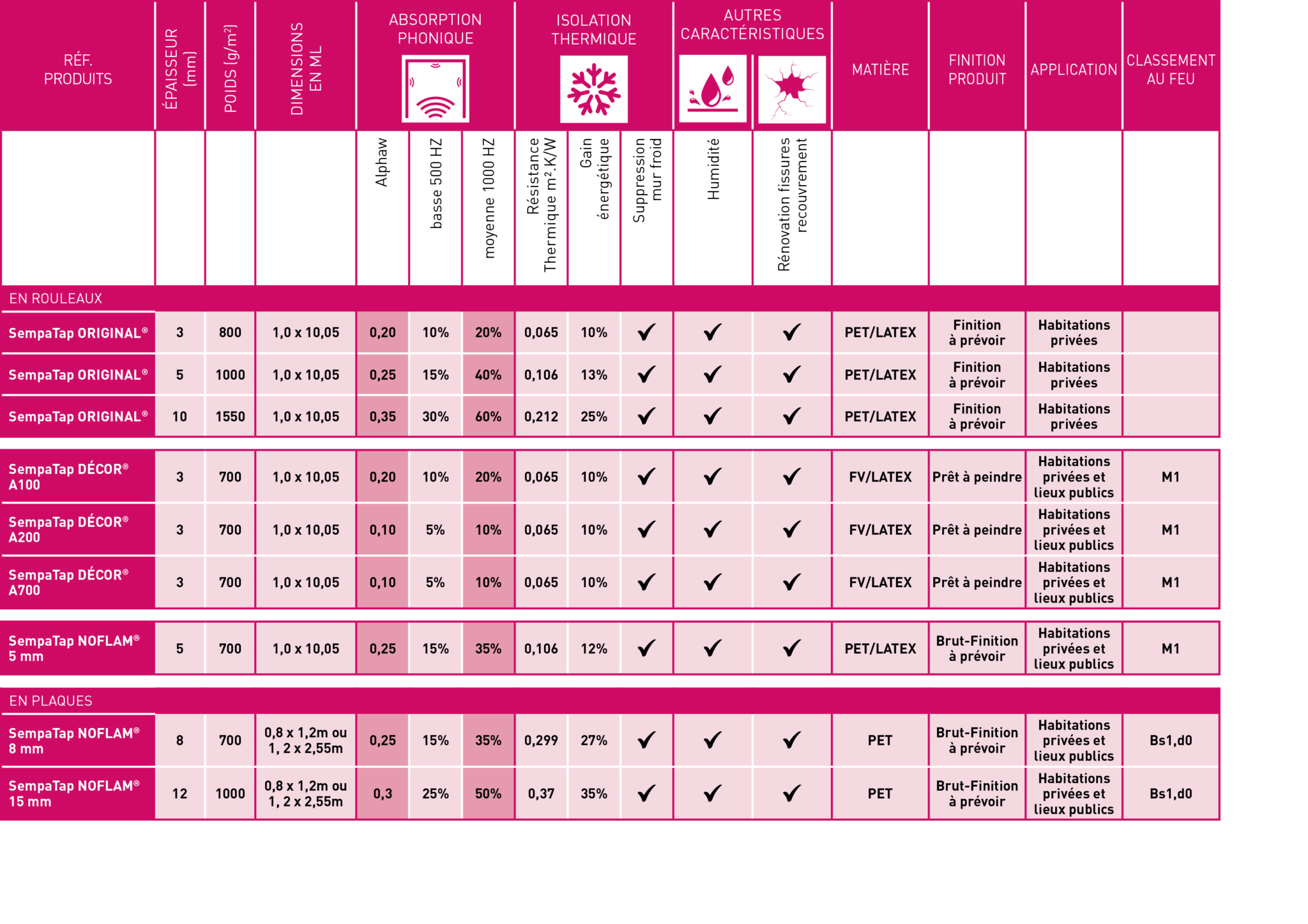 La technologie Wraptech®, permet à chaque produit de la gamme SempaTap® d’additionner les avantages de l’absorption acoustique, de l’isolation thermique, d’être anti-fissure et de lutter contre l’humidité et les ponts thermiques.